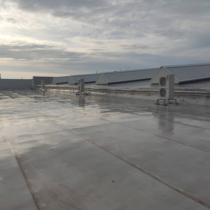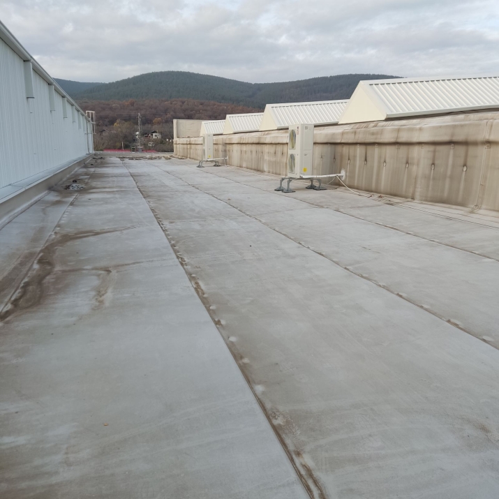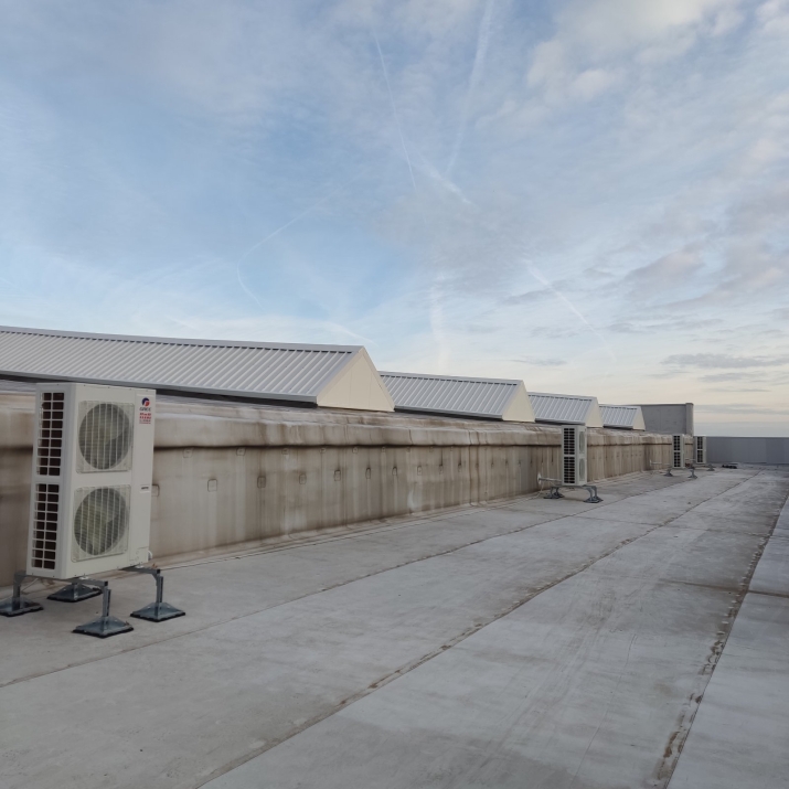 Склад за крепежни елементи с. Хрищени с обща разгърната площ от над 4000 квадратни метра се климатицира с десет броя инверторни канални климатизатора разделен тип подвързани към вентилационен пакет с нагнетателни вентилатори за по-добра циркулация на въздуха.