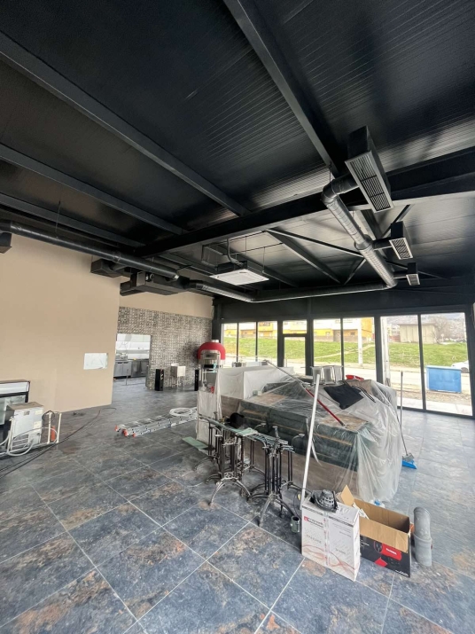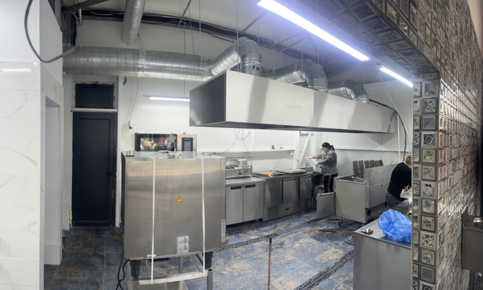 Инсталирана е и вентилационна система за кухнята на обекта. Специално изработен кухненски смукателен чадър от неръждаема стомана, островен, в комплект с лабиринтни филтри е подвързан към центробежен вентилатор с изнесен двигател и едностранно засмукване.